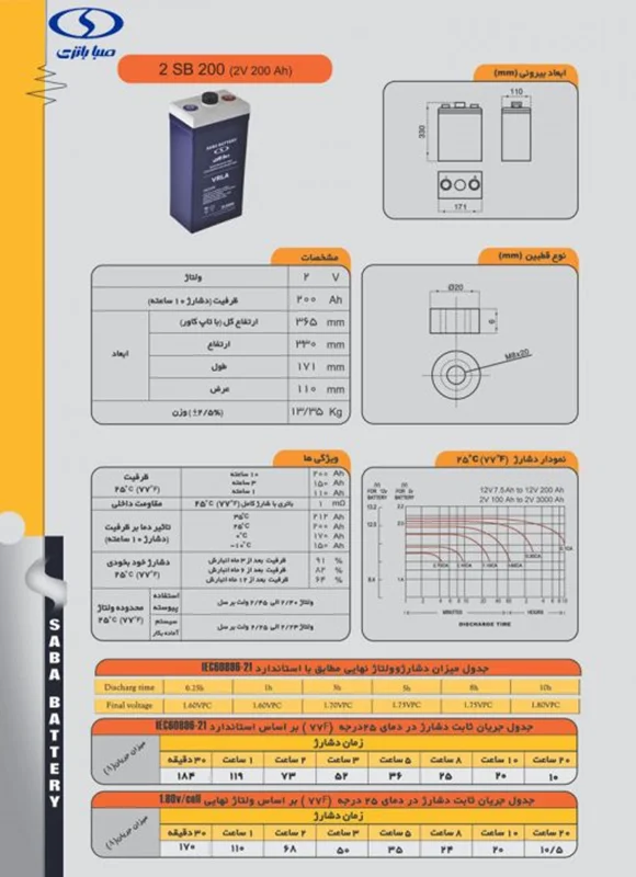 باتری 2 ولت 200 آمپر ساعت صبا باتری در صورت نگهداری اصولی دارای طول عمر 10 سال یا بیشتر است و دارای ساختار لولهای در صفحات مثبت بوده و این ویژگی موجب شده که باتری توان بالایی در جلوگیری از ریزش مواد فعال داشته و طول عمر نسبتاً طولانی تری را ارائه کند. در تولید این باتری از مواد ABS شفاف مقاوم در برابر ضربه استفاده شده که امکان کنترل وضعیت داخلی باتری را فراهم میکند.